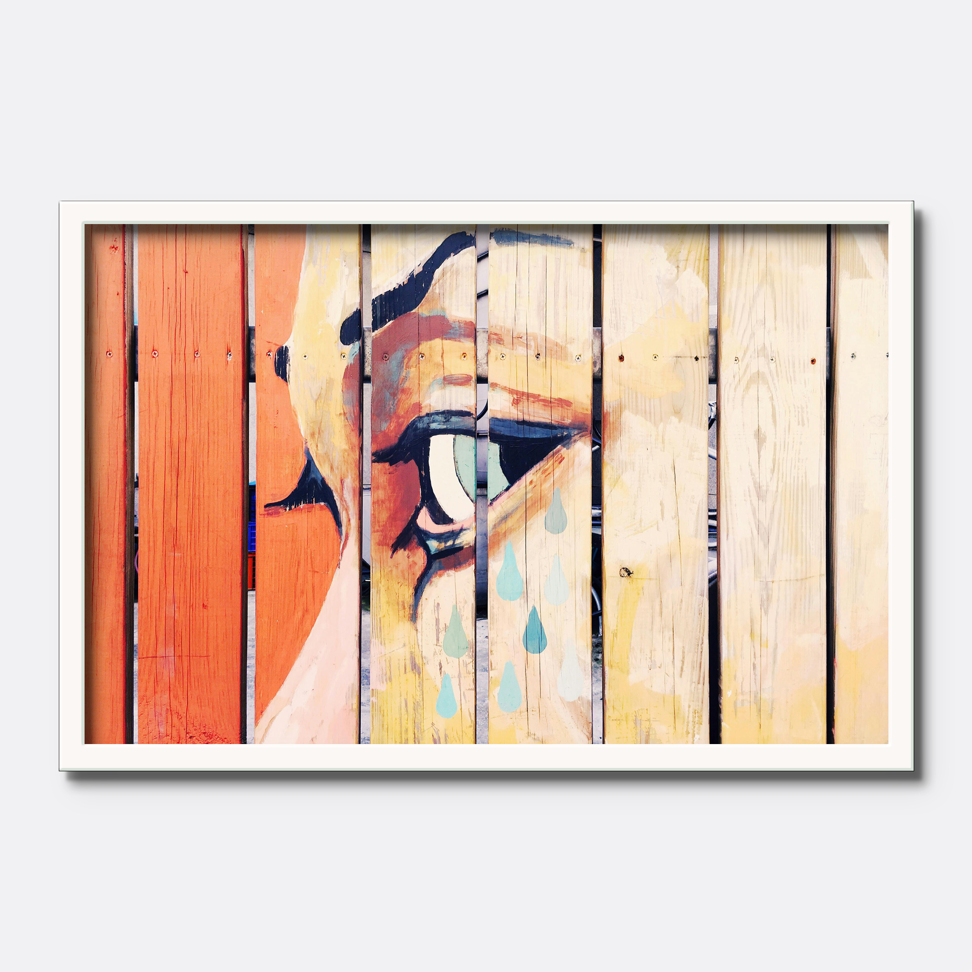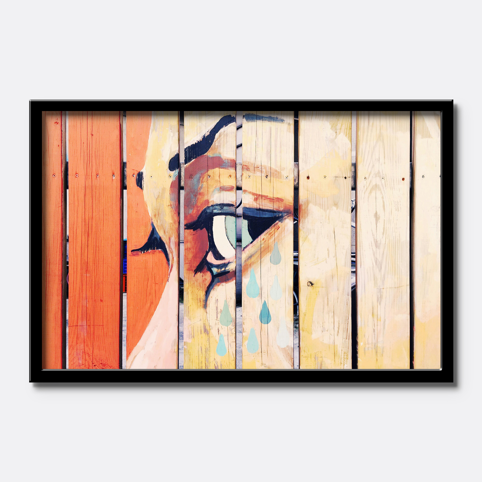 This artwork captures an expressive eye illustrated across vertical wooden-plank styled panels, blending warm oranges, yellows, and soft pastels with raw texture and emotion.