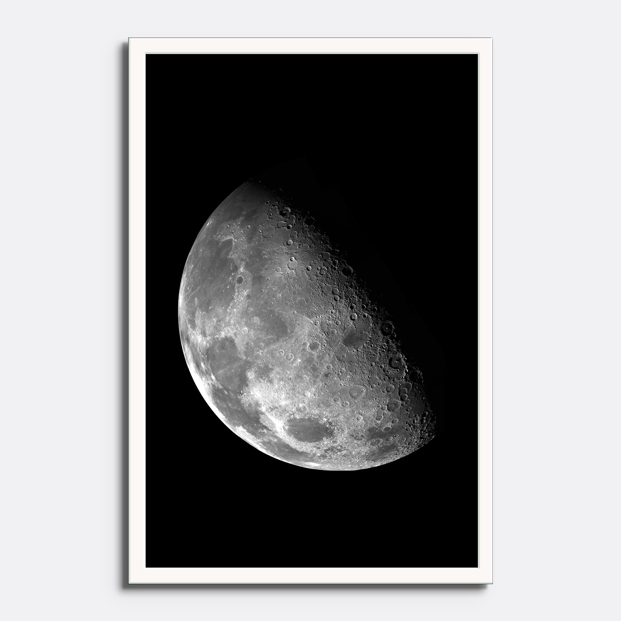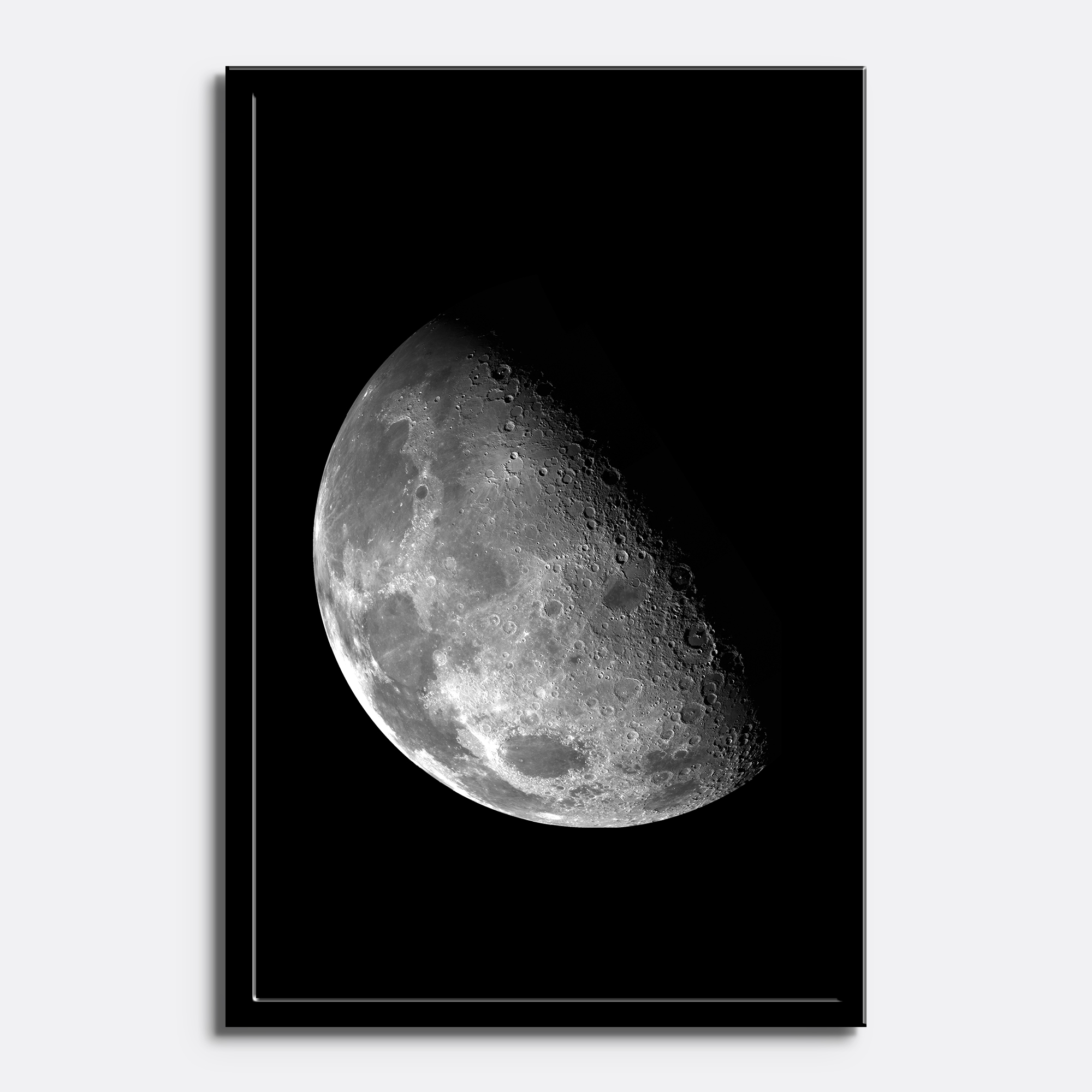 Captured in exceptional detail, this monochrome moon print reveals: