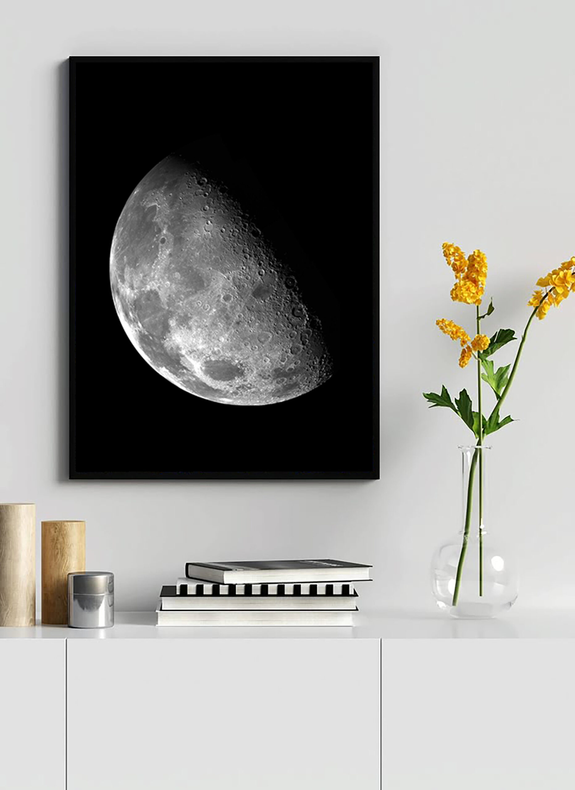 Its dramatic black background and realistic moon texture make this artwork a luxurious, eye-catching addition to any interior.